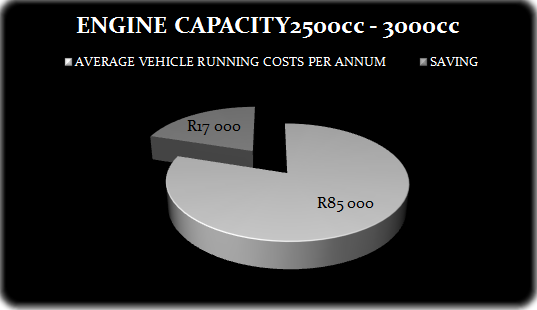 As an example the average operating costs for a vehicle with a engine capacity of between 2500cc and 300occ travelling 50000km per annum is approximately R85 000. These include relative fuel, servicing, repairs, tyres and lubrication costs, if consistent effective preventative maintenance is applied will result in a significant annual saving of approximately R17 000.